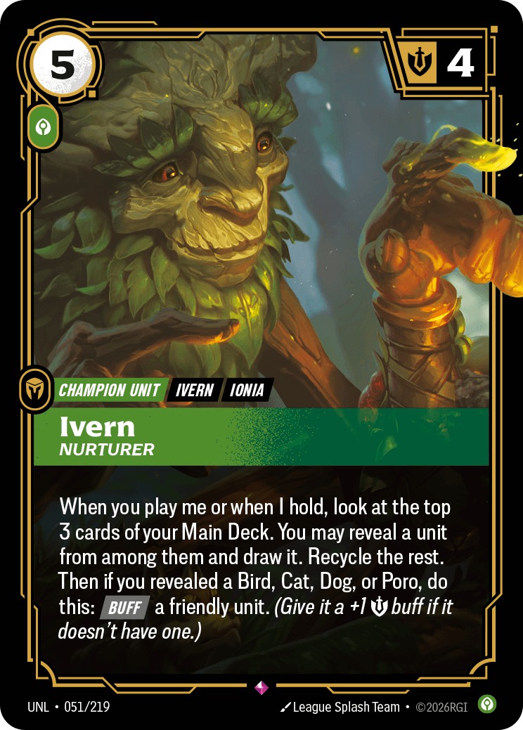 When you play me or when I hold, look at the top 3 cards of your Main Deck. You may reveal a unit from among them and draw it. Recycle the rest. Then if you revealed a Bird, Cat, Dog, or Poro, do this: BUFF a friendly unit. (Give it a +1 buff if it doesn't have one.)