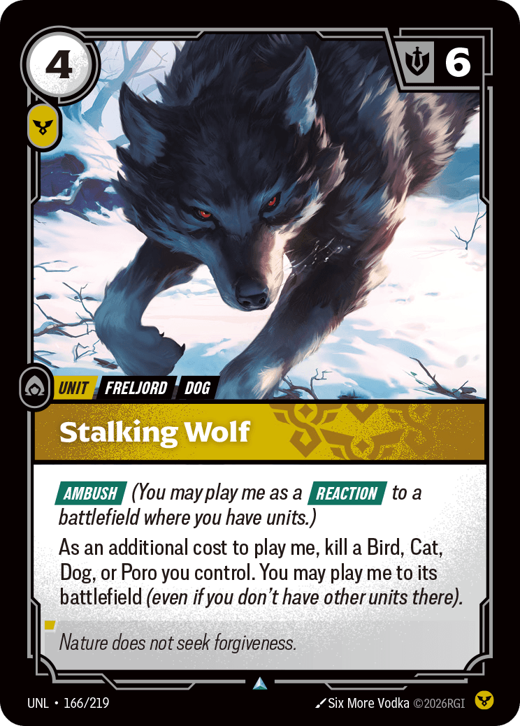 AMBUSH (You may play me as a REACTION to a battlefield where you have units.) As an additional cost to play me, kill a Bird, Cat, Dog, or Poro you control. You may play me to its battlefield (even if you don't have other units there) .