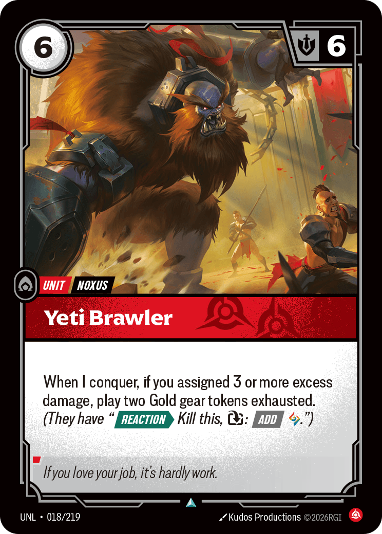 When I conquer, if you assigned 3 or more excess damage, play two Gold gear tokens exhausted. (They have "REACTION> Kill this, :rb_exhaust:: ADD .")